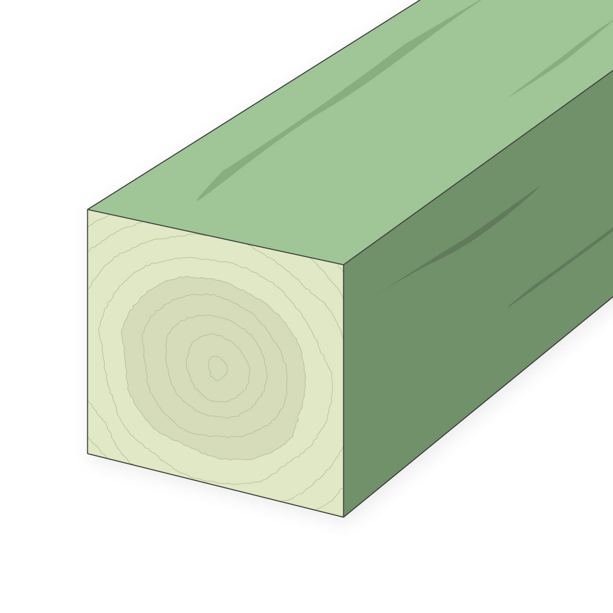 Virke i tryckimpregnerat trä för trästommar och byggnation utomhus. Sparrar eller stolpar används främst för lodräta konstruktioner.